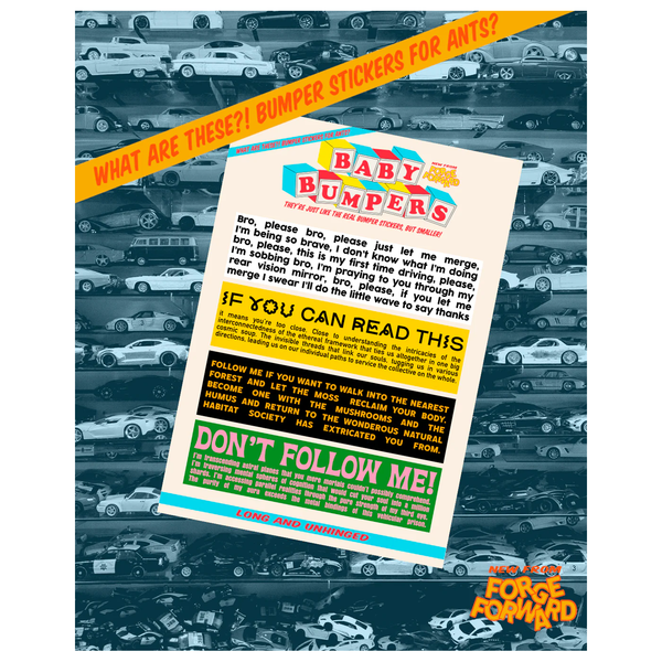 Do you like LONG AND UNHINGED stickers that take a minute to read? Then you'll love these shrunk down baby bumpers of the iconic Forge Forward BIG bumper stickers!