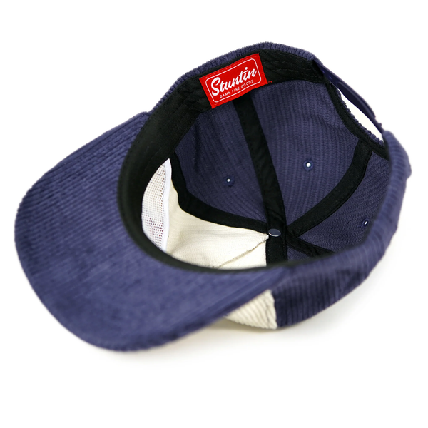 The happy tiger illustration blends styles found in traditional tattooing and Korean and Chinese paintings, on a two-tone cream and midnight blue corduroy hat. Drawn in-house by Stuntin.